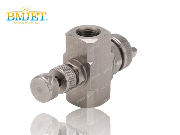 此裝置空氣霧化噴頭特殊的內(nèi)部結(jié)構(gòu)設(shè)計(jì)能使氣體和液體均勻混合,產(chǎn)生微細(xì)液滴尺寸的噴霧或粗液滴噴霧。通常,通過降低液體壓力或增加氣體壓力可得到更加微細(xì)的液滴噴霧,從而導(dǎo)致較高的氣體流動(dòng)率液體流率比。