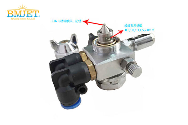 3、工業(yè)不銹鋼DK自動空氣霧化噴嘴可有效地維持黏滯液體的流動。驅(qū)動內(nèi)裝噴嘴清除針閥裝置可消除噴嘴的堵塞。